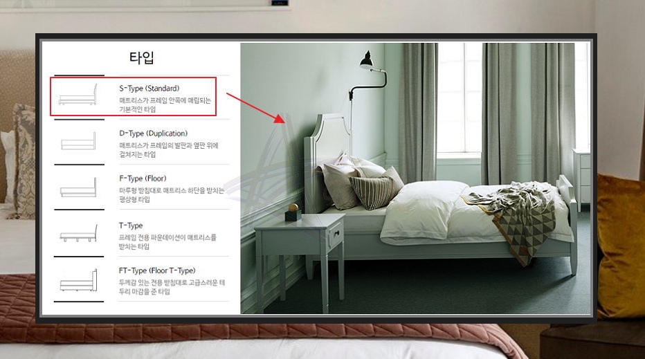 프레임의 사이즈는 매트리스는 같은 등급을 이용하면 되기 때문에 따로 생각하실 필요는 없습니다. 그것보다는 어떤 모양으로 되어 있는지 또는 받치는 형태를 선택하셔야 하는데요. 5가지 등급으로 S, D, F, T, FT가 있습니다.
