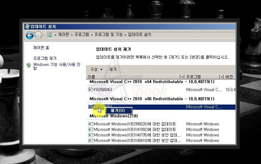 4. 업데이트 목록 중 KB 3086255 항목을 찾아 마우스 우클릭을 누른 후 제거 버튼을 누른다.