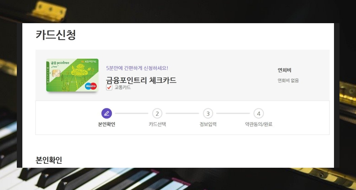 보시는 바와 같이 본인확인 → 카드선택 → 정보입력 → 약관동의/완료 이렇게 4단계로 진행하시면 돼요.