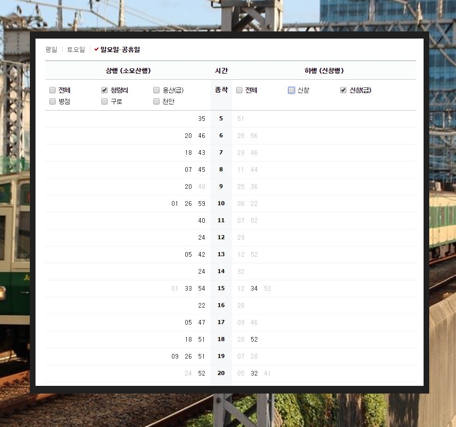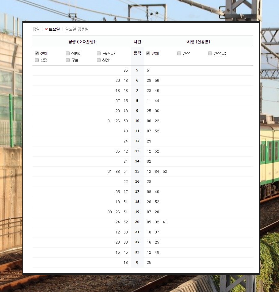▲ 메뉴에 있는 열차시간표를 클릭하면 세부적인 전철시간표를 확인할 수 있습니다.