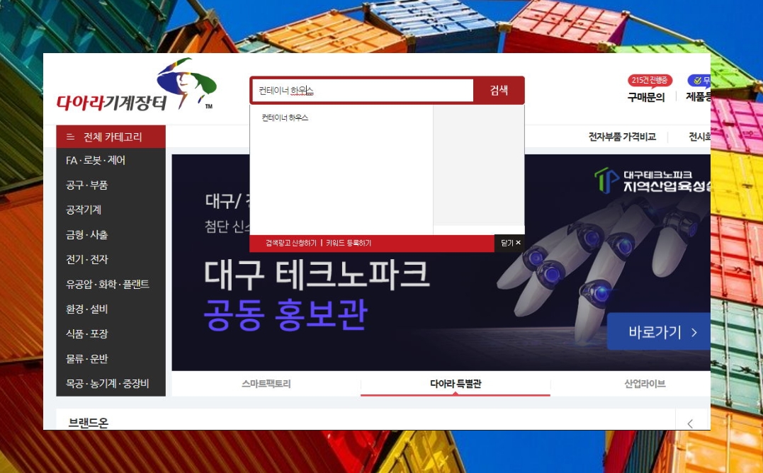 다아라 기계장터에서는 로봇, 공구, 공작기계, 환경 설비, 농기계, 중장비 등 다양한 것을 다룹니다. 당연히 여기에는 중고 컨테이너 하우스도 포함되어 있지요. 상단 중앙에 있는 검색 창에 "컨테이너 하우스"를 입력한 후 엔터키를 클릭해 주세요.
