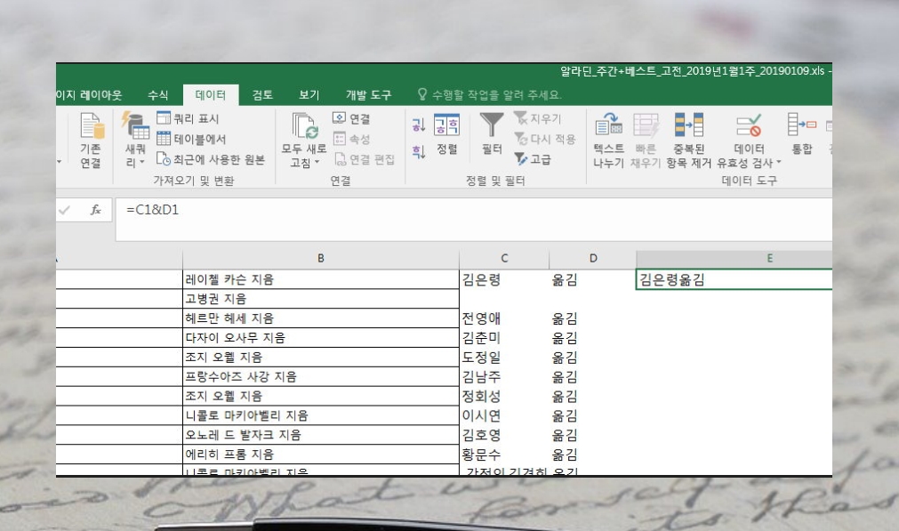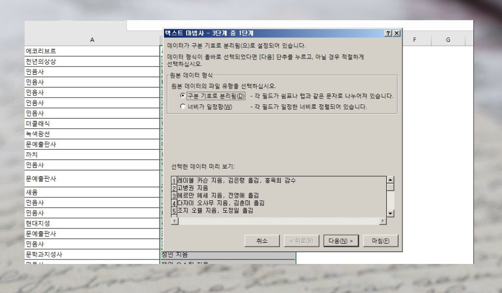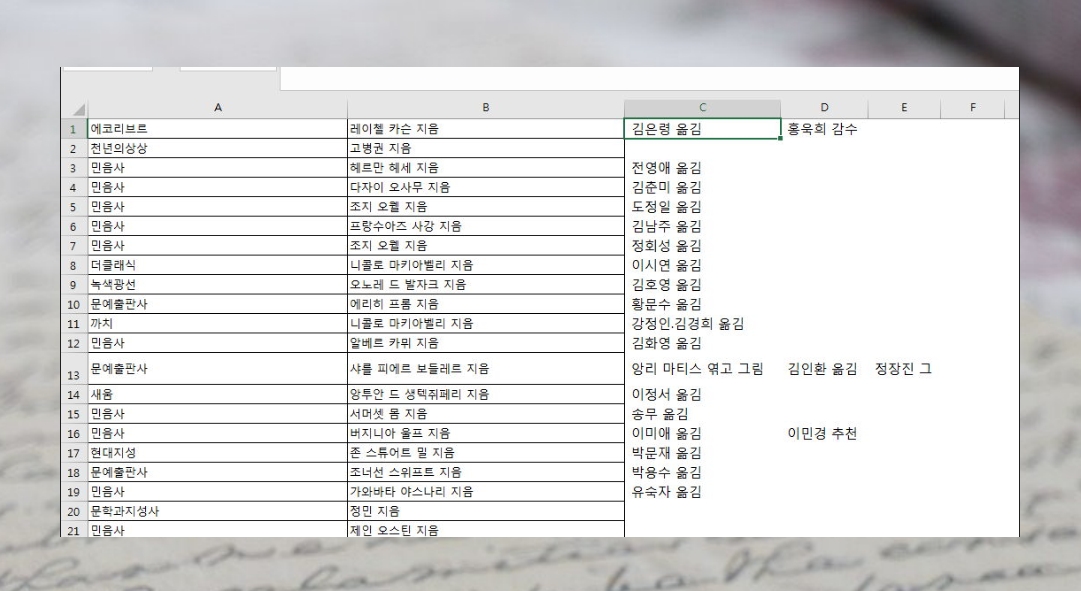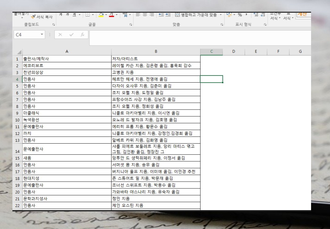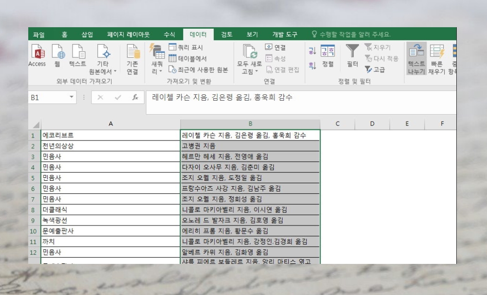 먼저 데이터를 준비했어요. 서점 사이트에서 뽑은 출판사와 저자 목록인데요. 저자 목록을 보면 공동 작업을 한 경우 여러 이름이 나오기도 하는데요. 지은이와 옮긴이가 다른 경우에도 그렇고요. 이럴 때 엑셀을 이용하면 돼요. 텍스트 나누기 기능을 이용하면 순식간에 할 수 있어요.