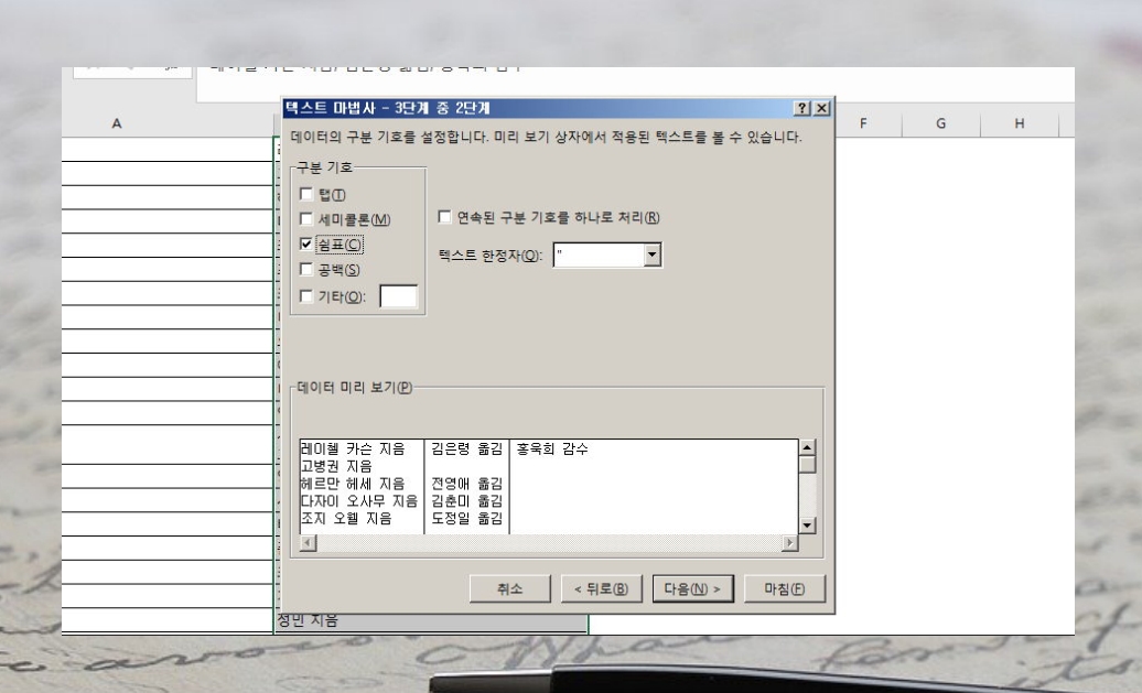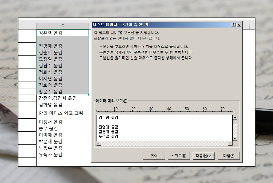 내용의 특정 위치를 기준으로 나누기를 하는 것도 쉬워요. 텍스트 마법사에서 '너비가 일정함'을 클릭한 후 다음 버튼을 눌러주세요. 그럼 이렇게 '데이터 미리 보기' 창에서 위치를 조절 할 수 있어요. 엑셀 강의에 있는 예시처럼 지정한 상태에서 마침을 누르면 각 저자의 이름과 '옮김'이 나뉘어 질 거에요.