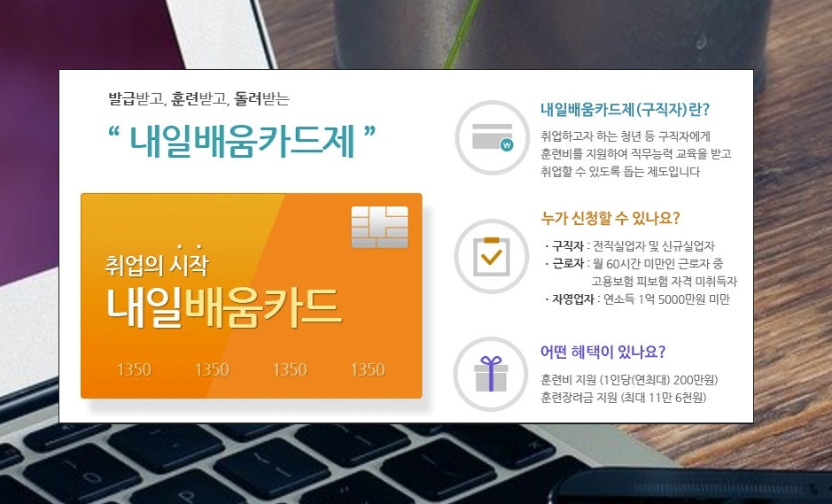 우선 내일배움카드에 대해 알려드릴게요. 취업을 원하는 사람들이 직무능력 교육을 받을 수 있도록 훈련비를 지원하는 제도에요. 취업이 잘 안되는 분들에게 자신의 실력을 쌓아 잘 되도록 이끌어 주기 위함이에요. 구직자인 경우에만 이용할 수 있는 것은 아니에요. 발급조건에 부합되는 근로자, 자영업자도 이용할 수 있어요.