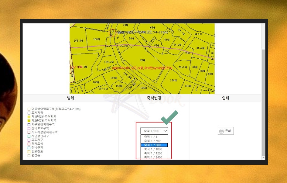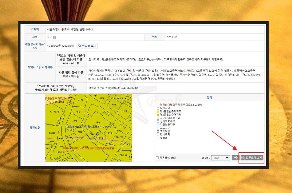 [도면 크게 보기] 버튼을 클릭하면 좀 더 넓게 지적도를 확인할 수 있어요. 축척 변경도 가능해요. 범례에 있는 고도지구, 정비구역, 일반 철도 등을 참고하면 토지를 알아보는 데에 도움이 될 거에요.