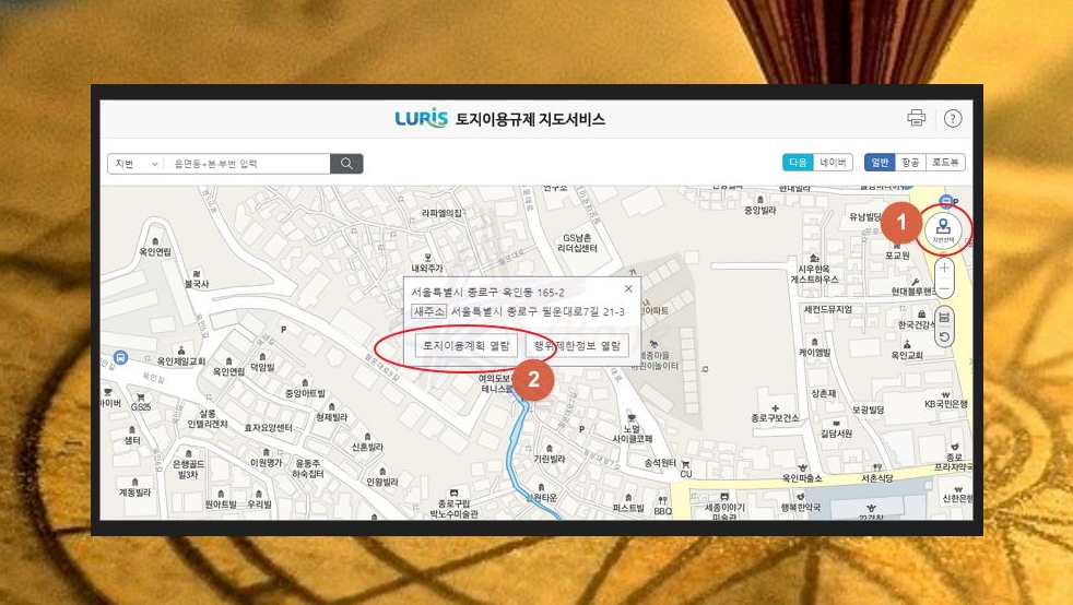 지도로 된 화면에서 무료로 열람을 하고 싶은 위치를 찾아주세요. 화면에 해당 위치가 나타났다면 우측에 있는 [지번 선택] 버튼을 클릭한 후 [토지이용계획 열람] 버튼을 클릭해 주세요.