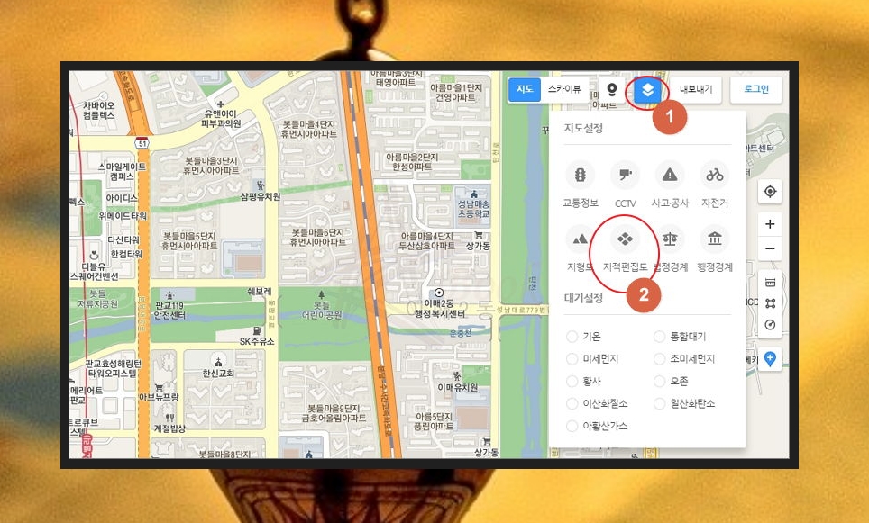카카오맵 사이트에 접속한 후 지적도를 보고 싶은 토지의 위치로 이동해 주세요. 이 상태에서 [내보내기] 버튼 옆에 있는 아이콘을 클릭해 보세요. 그럼 지도와 대기에 대한 설정을 할 수 있는 창이 뜨는데요. 여기에서 [지적편집도]를 클릭해 주세요.