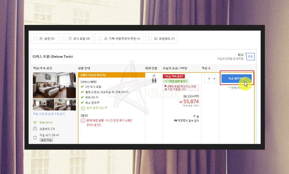 사이트에서 찾은 해외 숙박 업소를 바로 예약도 할 수 있어요. 이용하고 싶은 객실을 찾아보고, [지금 예약하기] 버튼을 클릭하면 돼요. 객실 안내 내용을 보면 무료 와이파이나 조식, 할인 이벤트 등을 확인할 수 있어요.