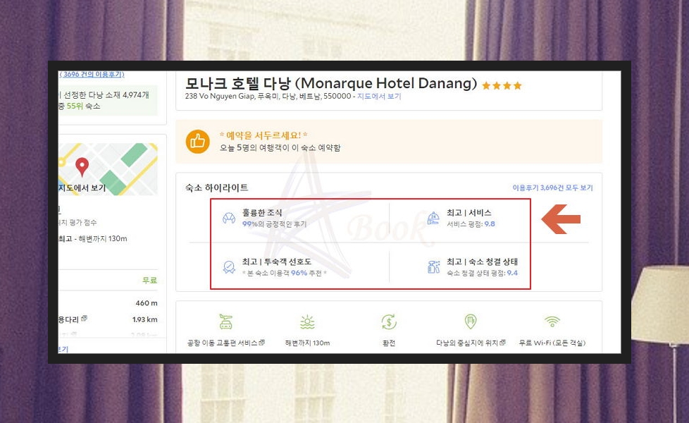 여러 해외 호텔에 대한 정보를 일일이 확인할 시간이 없는 경우가 있어요. 이럴 때에는 사이트에서 안내하는 숙소 하이라이트 부분을 중점적으로 살펴보면 돼요. 조식, 서비스, 숙소 청결 상태, 투숙객 선호도를 수치로 확인할 수 있어요.
