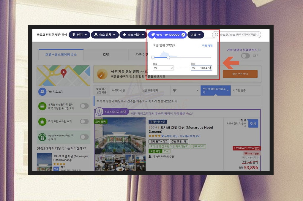 [빠르고 편리한 맞춤 검색] 기능도 이용하면 마음에 드는 해외 숙소를 찾는 데에 도움이 돼요. 저는 요금 범위를 지정하는 기능을 주로 사용하는데요. 사람마다 선호하는 1박당 숙박 요금이 있을 거에요. 아고다 사이트에서 해당 범위를 지정하면 예산에 맞는 해외 숙박 예약을 하는 데에 도움이 돼요.