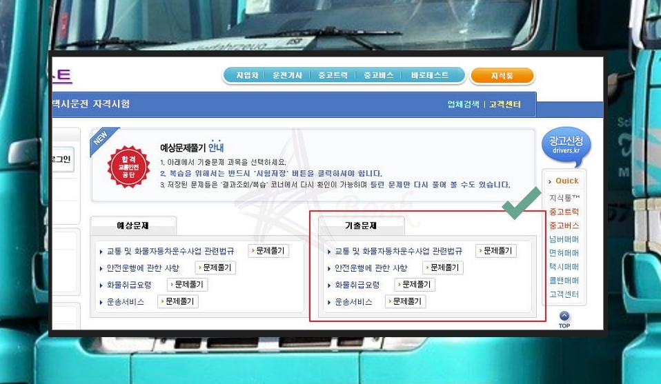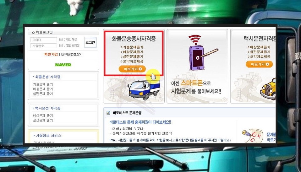 여기는 운전기사, 중고트럭, 중고버스, 지입차에 관련된 서비스를 제공하는 곳이에요. 화문운송 일을 하실 때 도움 되는 정보가 많을 거에요. 자격시험 기출문제 자료는 메뉴에 있는 바로테스트를 클릭하면 만나볼 수 있어요.