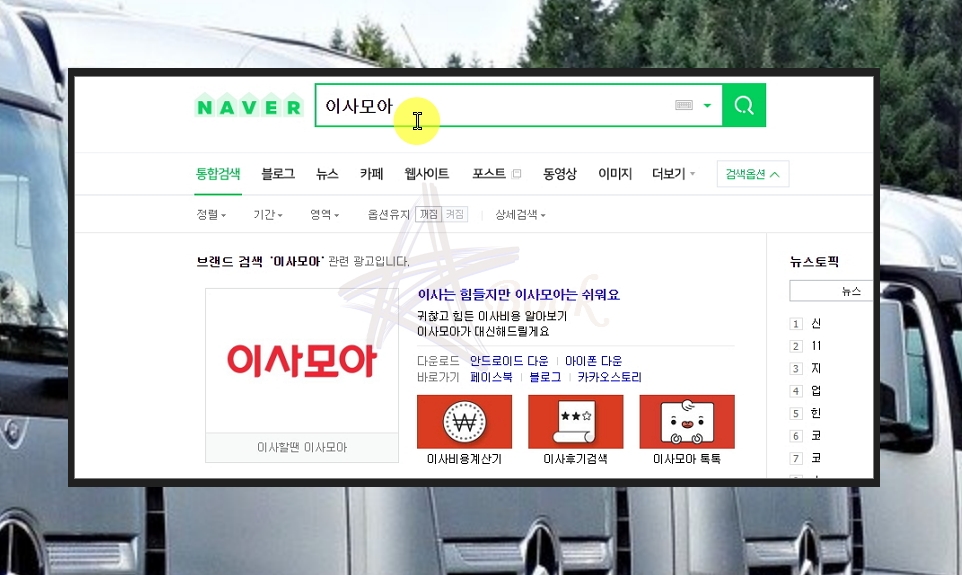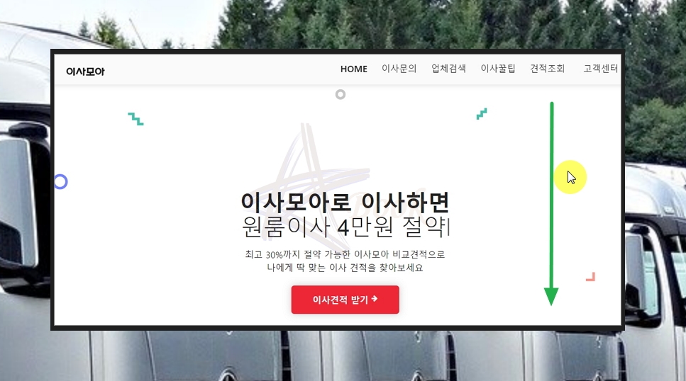 이사모아 사이트에 접속했어요. 보통 1톤트럭 하나면 충분한 원룸의 경우 이곳을 이용하면 4만원 절약을 할 수 있다고 하네요. 저렴한 이사를 하고 싶다면 여러 곳에서 견적을 받아 직접 비교하는 것이 좋아요. 일단 간단하게 비용을 알아볼게요. 메인화면에서 화면을 아랫쪽으로 내려보세요.
