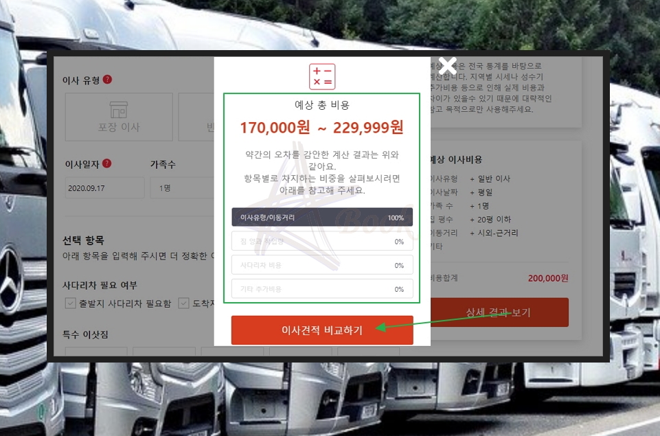 결과가 나타났어요. 업체에 따라 금액이 다르기 때문에 가격이 범위로 나와 있는데요. 실제로 얼마나 나오는지 정확히 알아보고 싶다면 견적을 받아보면 돼요. 결과창 아래에 있는 [이사견적 비교하기] 버튼을 클릭해 보세요.