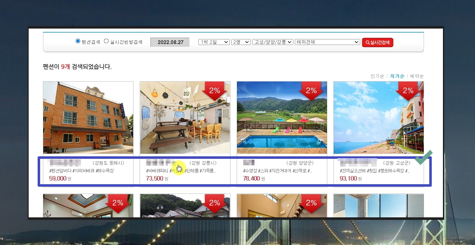날짜와 인원, 지역, 테마 정보를 입력한 후 [실시간 검색] 버튼을 눌러 보았습니다. 성수기임에도 불구하고, 9개의 펜션을 찾았습니다. 생각보다 많이 저렴한데요. 숙소이름 아래를 보면 테그가 붙어져 있습니다. 수영장, 스파, 자전거대여, 산책로, 해수욕장, 야외바케큐 등 여러 테그를 통해 해당 숙소의 특징을 쉽게 파악할 수 있습니다.