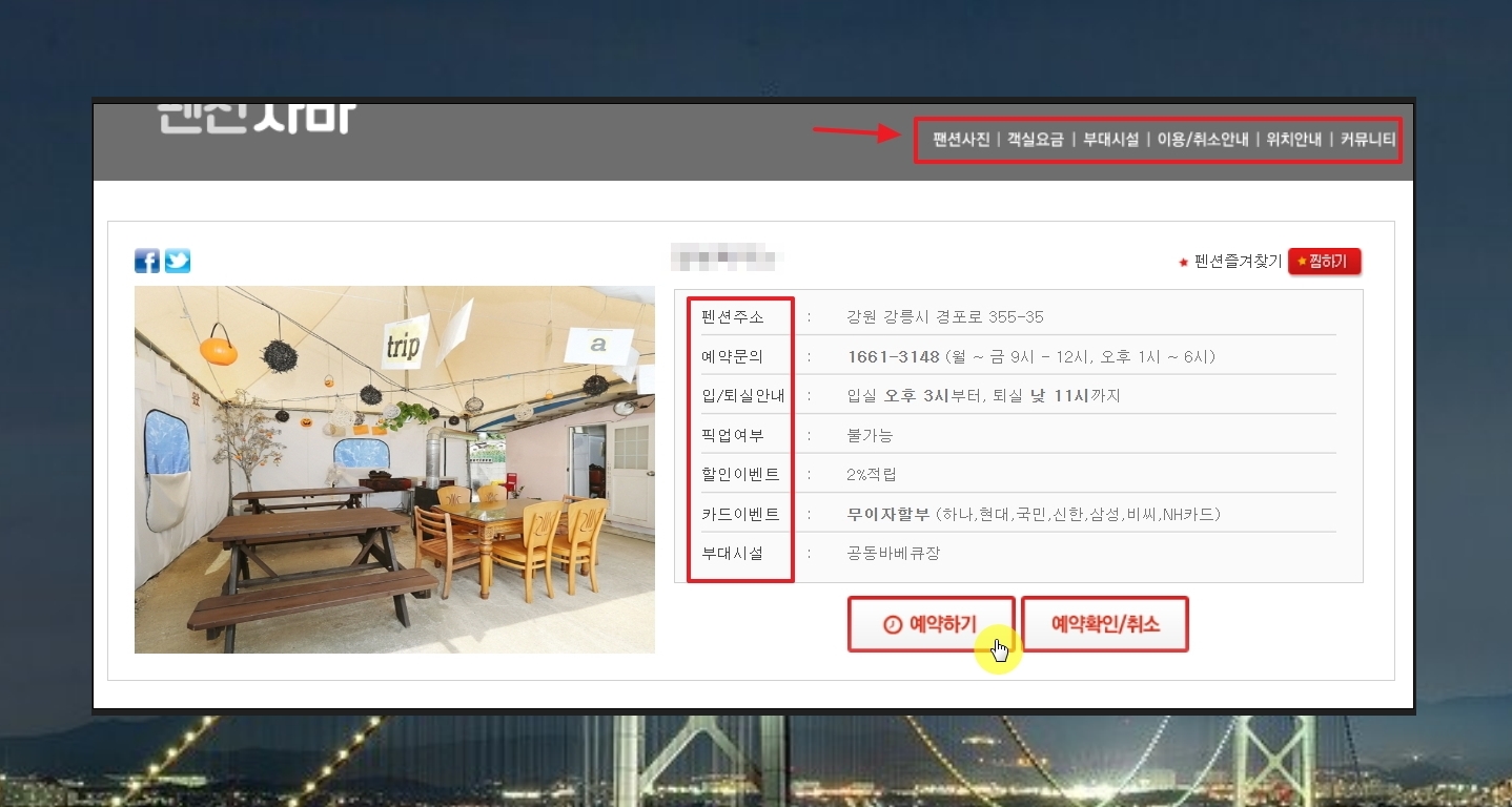 마음에 드는 강원도 숙소를 하나 선택해 보았습니다. 새롭게 열린 페이지를 통해 주소, 연락처, 입실 및 퇴실안내, 픽업 여부, 할인 이벤트 등의 정보를 확인할 수 있는데요. 사이트에 표시된 [예약하기] 버튼을 누르면 바로 예약 진행이 가능합니다. 추가적인 정보로는 숙소 사진, 객실요금, 부대시설, 이용 및 취소 안내, 위치 정보가 있는데요. 주요한 것을 한 번 살펴보겠습니다.