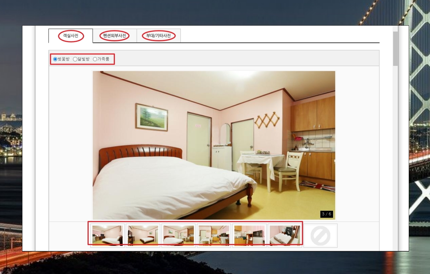 가장 먼저 사진입니다. 사이트에서는 객실, 펜션의 외부, 부대시설 및 기타 사진을 확인할 수 있는데요. 모든 종류의 객실 사진을 볼 수 있어서 좋습니다.