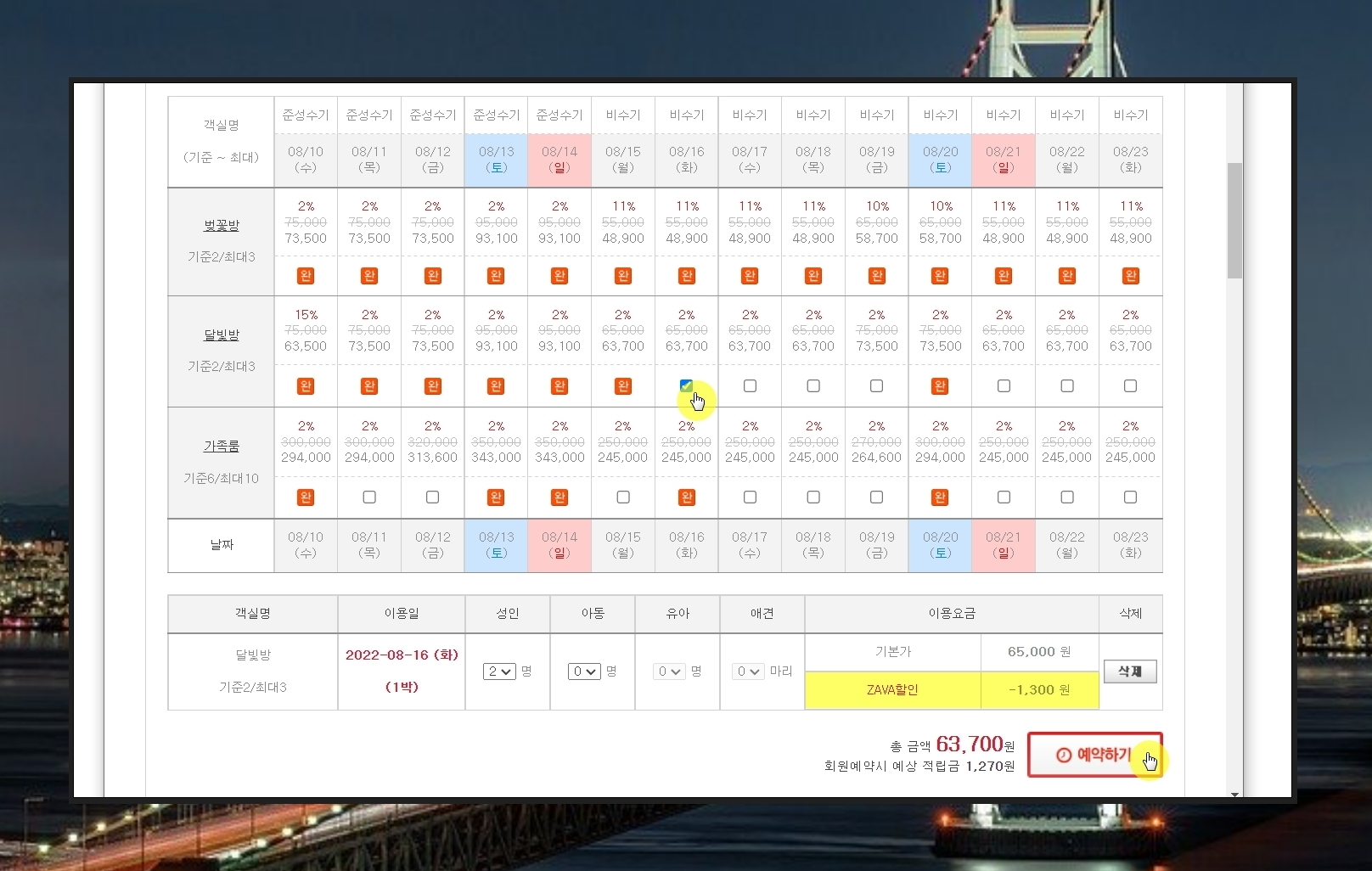 해당 사이트에서 개인적으로 가장 마음에 드는 것은 객실 현황입니다. 날짜별로 어느 객실의 예약이 완료되었고, 어느 객실이 선택 가능한지 쉽게 확인할 수 있게 되어 있습니다. 여기에서 마음에 드는 곳을 선택하여 예약을 진행할 수 있습니다. 해당 사이트에서 이용하면 2% 추가 할인을 받을 수 있네요.