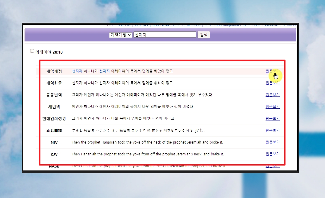 [번역 비교] 버튼을 누르면 이전 과정에서 보여드린 바와 같이 여러 가지 버전의 성경에서 구절 찾기를 할 수 있는데요. 해당 구절을 포함한 전체 내용을 읽고 싶다면 [원문 보기] 버튼을 누르면 됩니다.