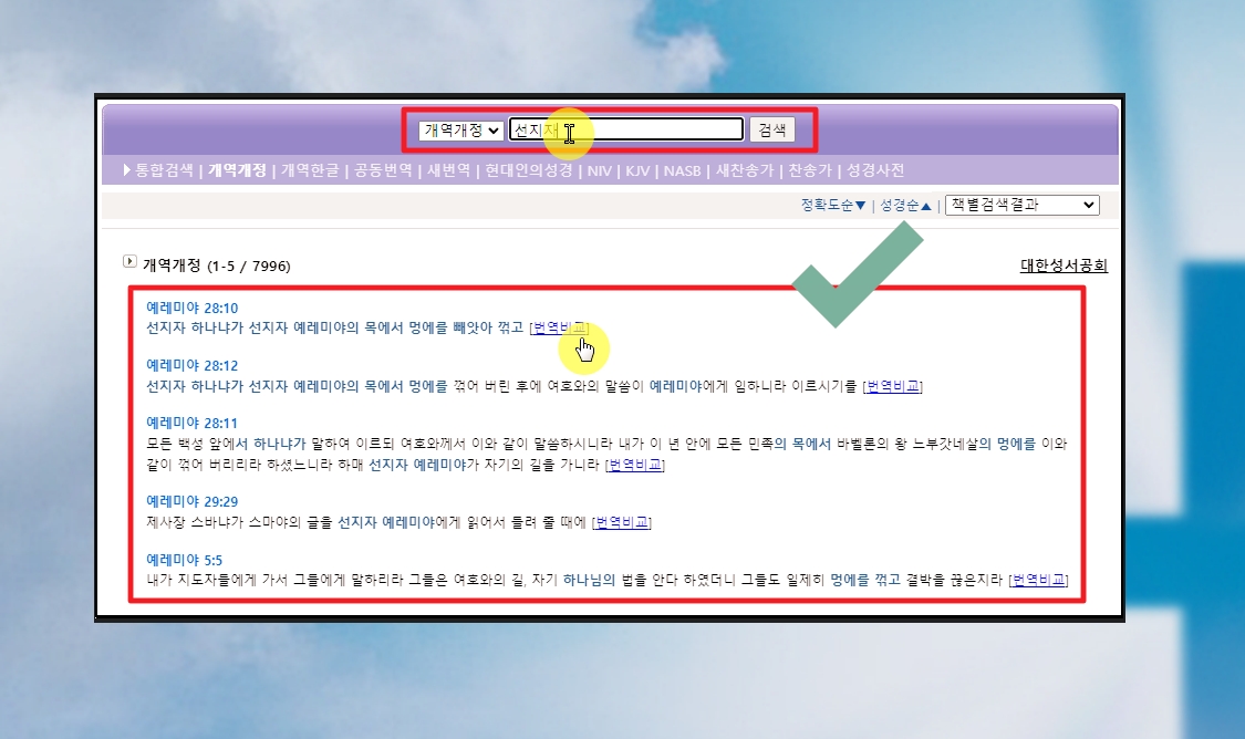 처음부터 끝까지 성경을 읽는 것은 물론이고, 여기에 속한 말씀 구절을 검색 및 찾기 할 수 있는 서비스를 이용해 보세요. 무료로 이용할 수 있기 때문에 부담이 전혀 없습니다. 검색 결과를 보면 아시겠지만, 다양한 버전의 내용을 찾아볼 수 있답니다.