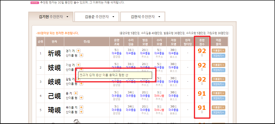간단하게 이용할 수 있는 프로그램을 통해 뜻이 좋은 것은 기본이고, 성명학 이론에 근거 좋은 평가를 받는 한자를 추천 받을 수 있습니다. 개별적으로 수리길흉, 발음오행, 수리오행, 자원오행, 음양조화 부분에 있어서 좋은 평가를 받는 것만 있는데요. 종합점수 기준으로 높은 점수를 받는 것만 추천을 해줍니다.