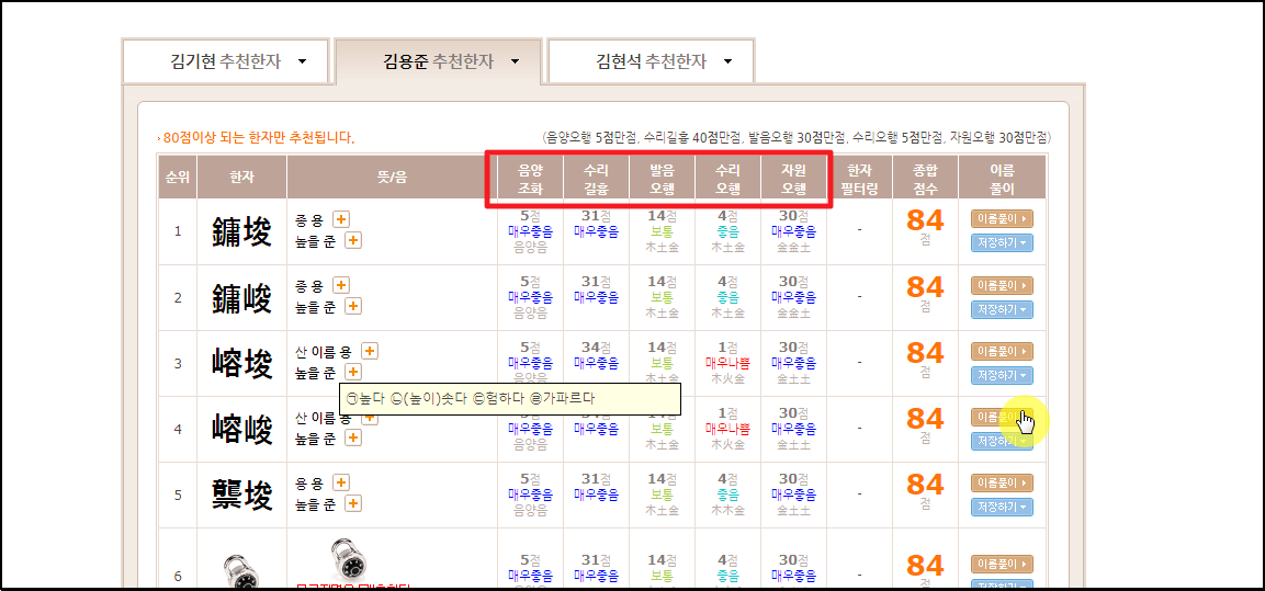 간단하게 이용할 수 있는 프로그램을 통해 뜻이 좋은 것은 기본이고, 성명학 이론에 근거 좋은 평가를 받는 한자를 추천 받을 수 있습니다. 개별적으로 수리길흉, 발음오행, 수리오행, 자원오행, 음양조화 부분에 있어서 좋은 평가를 받는 것만 있는데요. 종합점수 기준으로 높은 점수를 받는 것만 추천을 해줍니다.