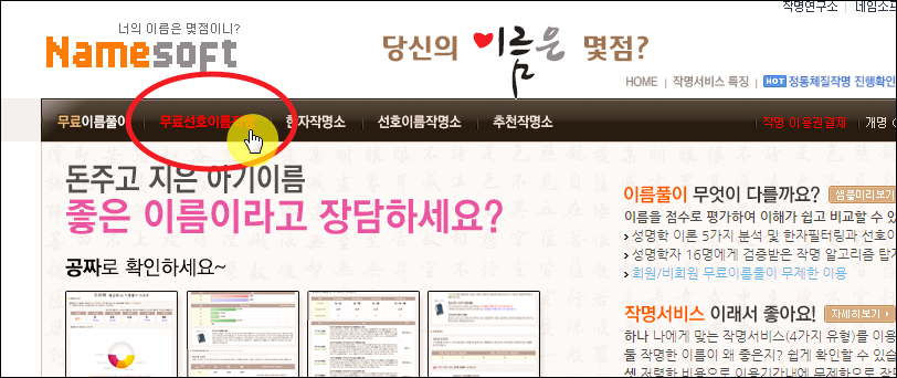 네임소프트 사이트에 접속했습니다. 메인화면에서 상단을 보면 여러 메뉴가 나타나는데요. 여기에서 [무료 선호 이름 작명] 메뉴를 선택해 주세요.