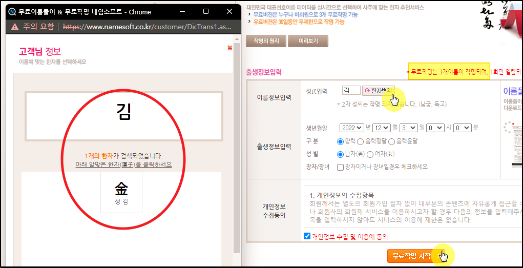 좋은 한자를 추천 받기 이전에 이름 찾기를 먼저 해야 합니다. 이때 출생정보를 입력해야 하는데요. 성 씨와 생년월인, 성별, 장자 또는 장녀 여부를 입력해 주면 됩니다. 성 씨의 경우에는 한자로 변환까지 해주셔야 합니다.