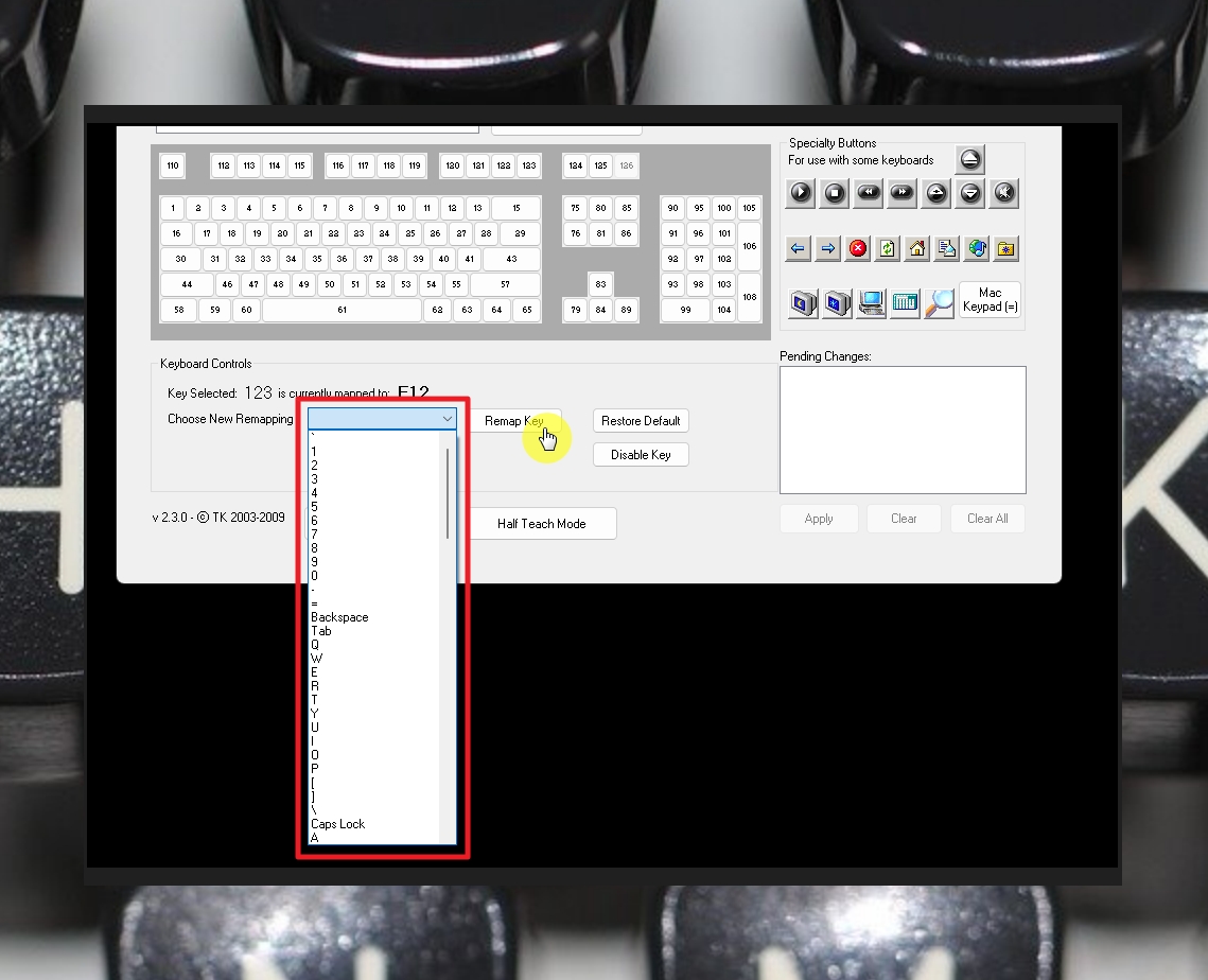 저는 "F12" 키를 선택했습니다. 하단에 보면 Keyboard Controls 영역이 있는데요. 여기에서 "Choose New Remaping" 문구 옆에 있는 셀렉트 박스를 클릭해 보세요. 그럼 해당 키보드 자판을 클릭했을 때 특정 키를 누른 것과 동일한 작업이 진행되도록 변경이 가능합니다. 셀렉트 박스에서 원하는 작업을 선택한 후 [Remap Key] 버튼을 클릭해 주세요.