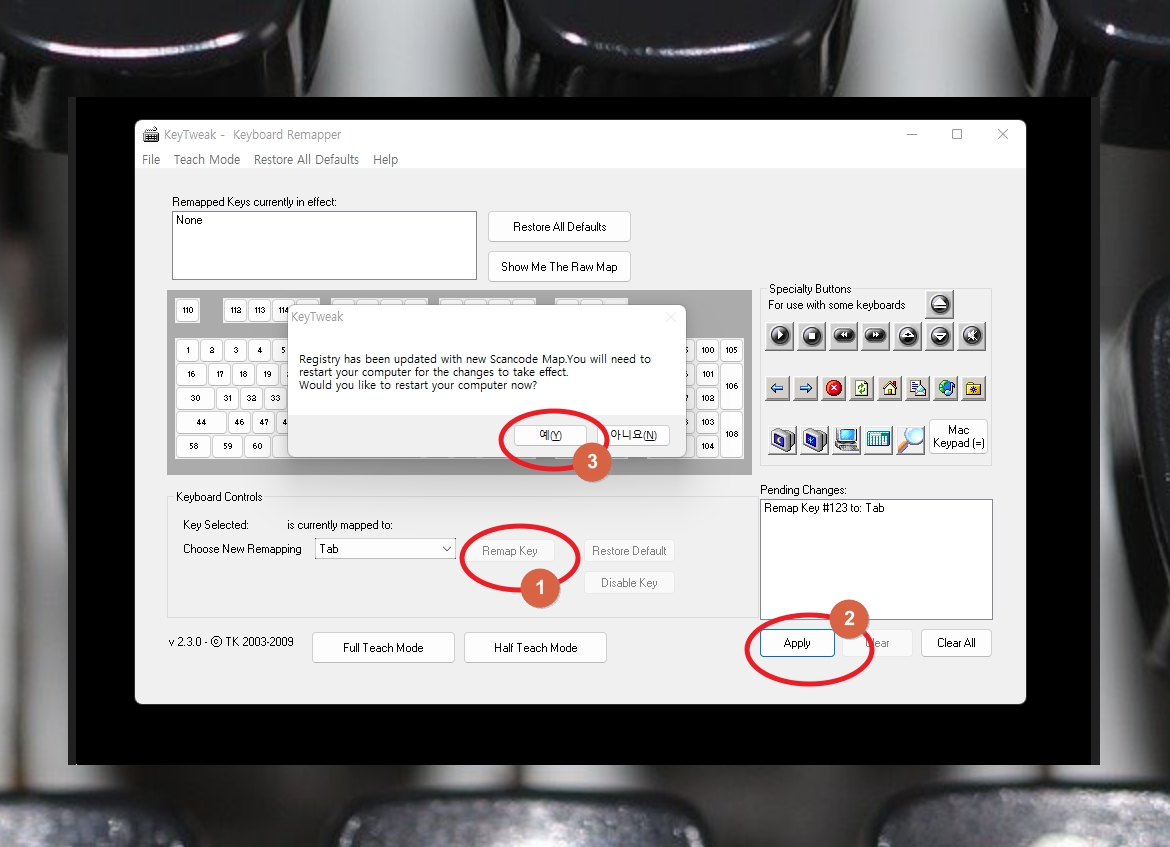 프로그램에서 우측 하단에 보면 "Pending Changes" 영역이 있는데요. 우리가 자판 배열을 변경할 때마다 여기에 내용이 추가됩니다. 모두 추가한 상태에서 [Apply] 버튼을 눌러주세요. 그럼 새로운 알림창이 나타나는데요. 여기에서 [예] 버튼을 클릭하면 키보드 자판 배열에 대한 변경을 진행할 수 있습니다. 한 가지 주의해야 할 사항이 있는데요. 해당 버튼을 누르면 바로 컴퓨터가 재시작 됩니다. 기존에 작동 중이던 프로그램을 종료한 다음에 [예] 버튼을 클릭하시는 것이 좋습니다.