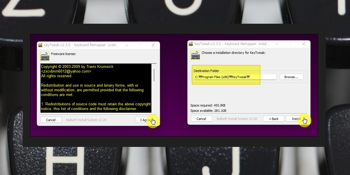 다운 받을 설치 파일을 실행해 보게습니다. 영어로 되어 있는 약관을 살펴보고, [I Agree] 버튼을 누릅니다. 약관을 기준으로 좌측 상단에 보면 "Freeware" 문구가 있는데요. '무료로 사용할 수 있는 소프트웨어'라는 의미입니다. 버튼을 누르면 KeyTweak 프로그램을 설치할 폴더를 지정해야 하는데요. 원하는 폴더로 설정한 후 [Install]을 클릭해 주세요.