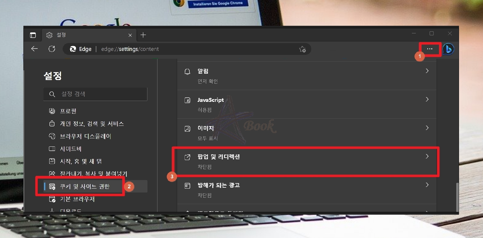 마이크로소프트 엣지 브라우저에서 Popup에 관련된 설정을 하는 것은 크롬 브라우저와 크게 다르지 않습니다. 점 3개 버튼을 선택한 후, 설정 페이지로 들어가 "쿠키 및 사이트 권한" 메뉴를 클릭해 주세요. 여기에서 "팝업 및 리디렉션" 항목을 찾을 수 있습니다.