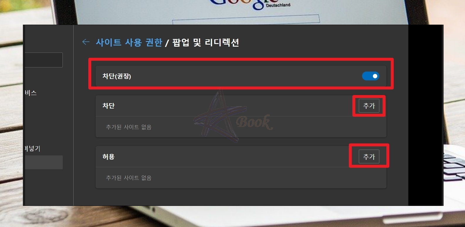 기본 동작 부분을 보면 간단하게 브라우저 팝업차단 해제를 할 수 있는데요. 첫 번째 항목은 기본적으로 Popup에 대하여 차단 해제를 의미하는 것이고, 두 번째 항목은 차단 하는 것을 의미합니다.