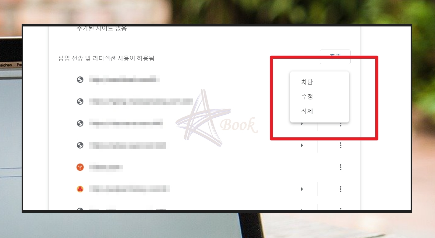 다음 카테고리를 보면 여러가지 사이트에 대한 개별적인 셋팅이 가능한데요. 저의 경우에도 일부 사이트에 대해서는 Popup창이 나타나도록 허용이 되어 있음을 알 수 있습니다. 이러한 것을 차단하고 싶다면 각 사이트 우측에 있는 점 3개 버튼을 클릭한 후 차단 또는 삭제를 눌러주세요.