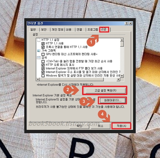 ▲ 옵션창에서 [고급] - [고급 설정 복원] - [원래대로] - [적용] 클릭