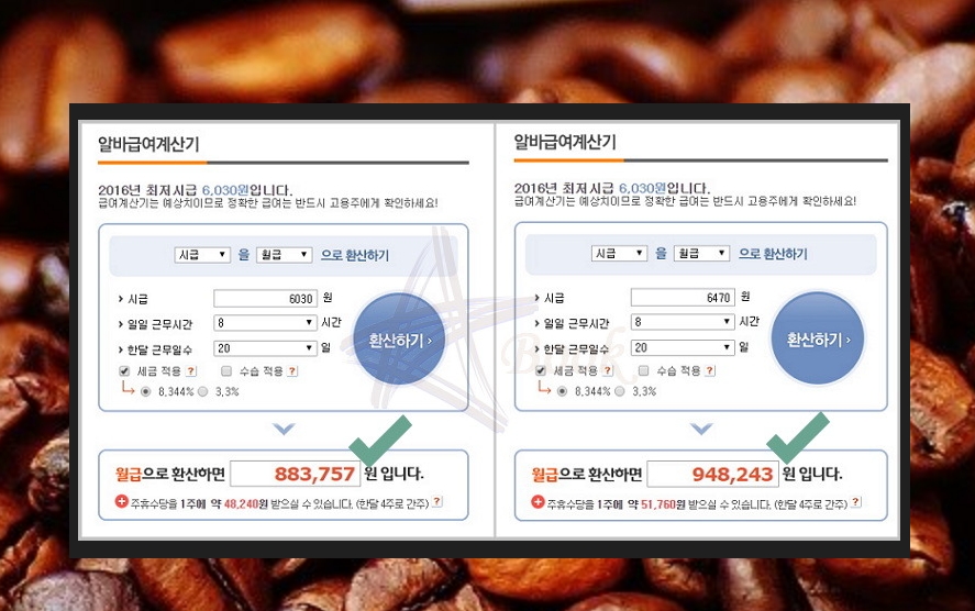 사람마다 시급이 다르기 때문에 받는 월급도 달라지는데요. 올해 2016년 최저임금은 시간당 6030원이었습니다. 이 금액을 기준으로 일주일 동안 40시간을 일했다면 얼마일까요? 계산기를 두들겨본 결과 126만 270원이 나오네요.