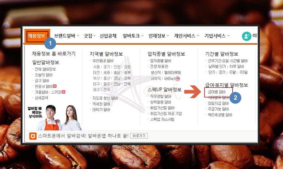 채용정보 ▷ 급여별 알바 클릭