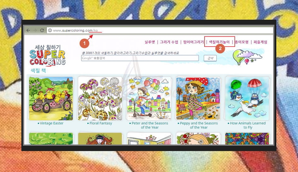 사이트 주소 뒤에 "/KO"라고 입력하면 한글 사이트로 변경이 됩니다. 색칠공부 자료를 얻기 위해서 '색칠하기 놀이'를 클릭해주세요.