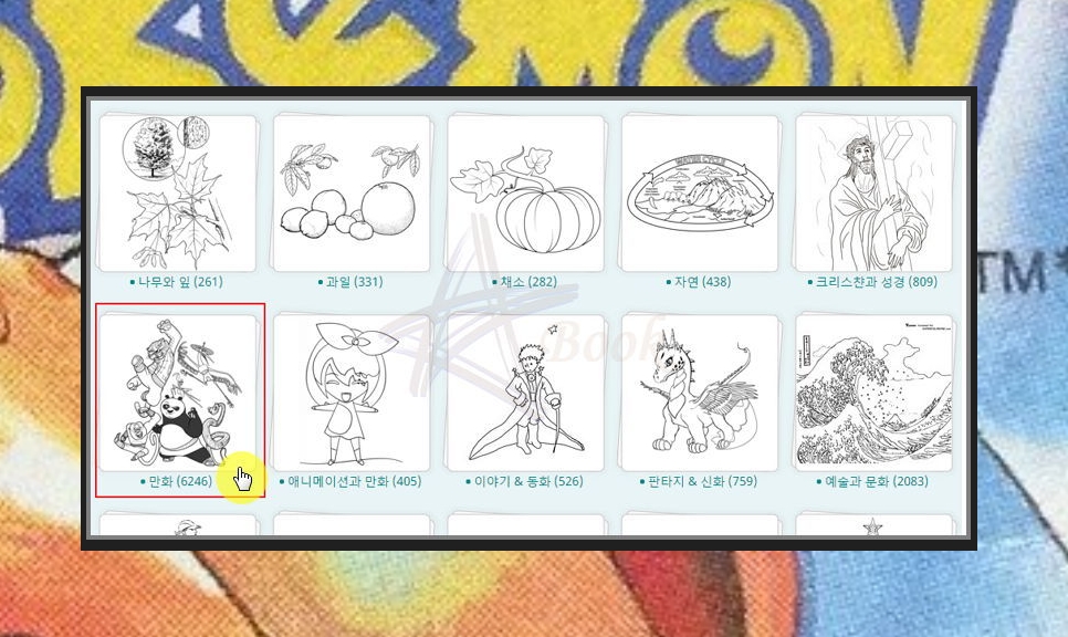 포켓몬스터는 만화 섹션에 있습니다. 보시는 바와 같이 과일, 채소, 자연, 판타지, 동화, 애니메이션, 예술 등 다양한 분야에 대한 자료를 얻을 수 있어요.