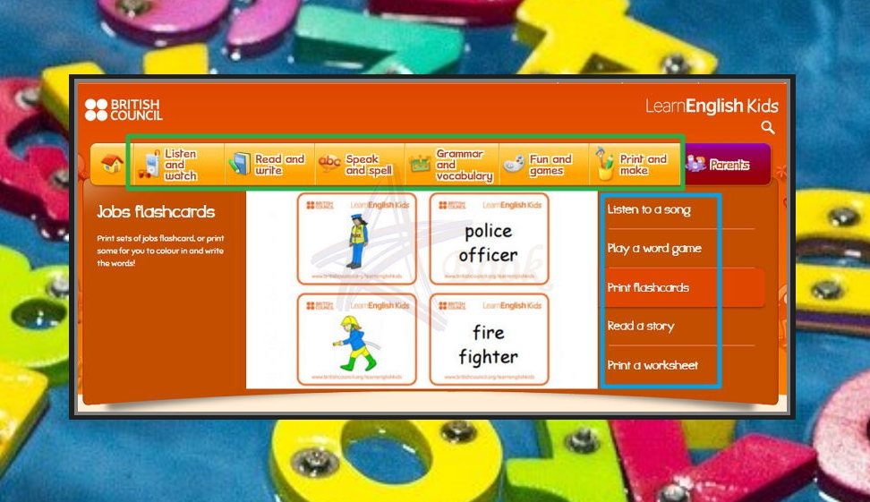 사이트에서는 정규 학습방법에 비해 비교적 즐거운 초등영어 공부방법을 제공하고 있는데요. 메뉴를 보면 듣기와 보기, 읽기와 쓰기, 말하기와 철자, 문법과 단어, 게임, 그리기와 만들기 등 학습방법이 매우 많습니다. 플래시 카드의 경우에는 인쇄할 수 있도록 파일을 제공하고 있으니 초등학생 자녀와 함께 만들어 보세요.