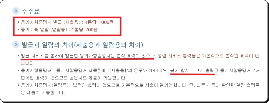 보통 공공기관에서 운영하는 "인터넷 등기소" 사이트에서 등기부등본을 열람하거나 발급 받는데요. 이 경우에 다음과 같은 수수료가 발생합니다.