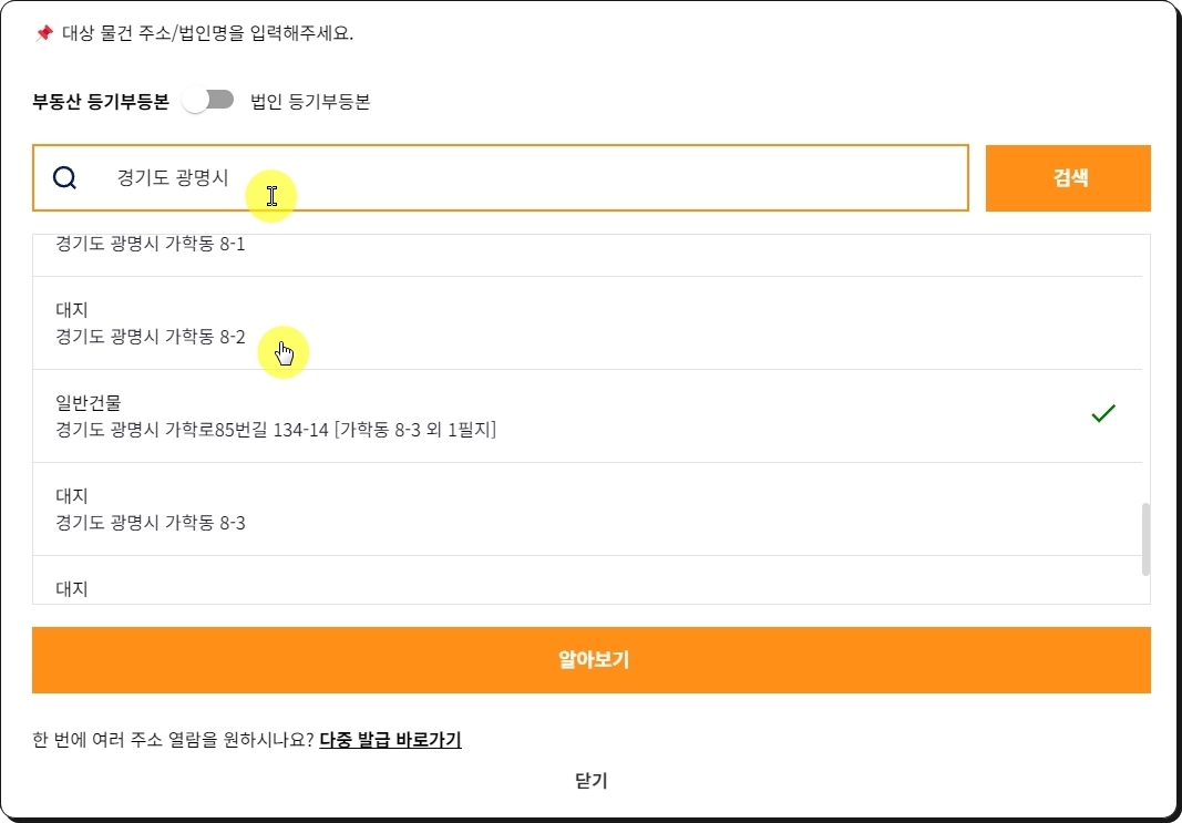 저처럼 주소의 일부를 입력한 후 [검색] 버튼을 눌러보세요. 그러면 무료열람이 가능한 주소 리스트가 나타납니다. 이 중에서 하나를 선택해 주세요.