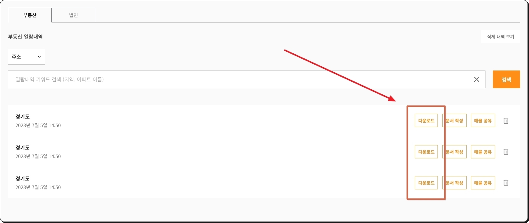 이렇게 한 번 열어본 서류를 나중에 다시 보고 싶을 때가 있습니다. 이러한 경우 "부동산 열람내역" 메뉴를 선택해 보세요. 그럼 과거에 열어보았던 주소 리스트가 나타납니다. 여기에서 [다운로드] 버튼을 눌러주세요.
