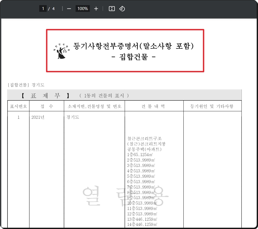 이제부터 등기부등본 서류를 무료로 확인하는 방법을 알려드리도록 하겠습니다. 제가 방금 인터넷으로 열어본 서류인데요. 보시는 바와 같이 우리가 평소에 보던 "등기사항전부증명서"가 맞습니다. 그럼 다음 단계부터 어떻게 무료로 이 서류를 받아볼 수 있는지 알려드릴게요.