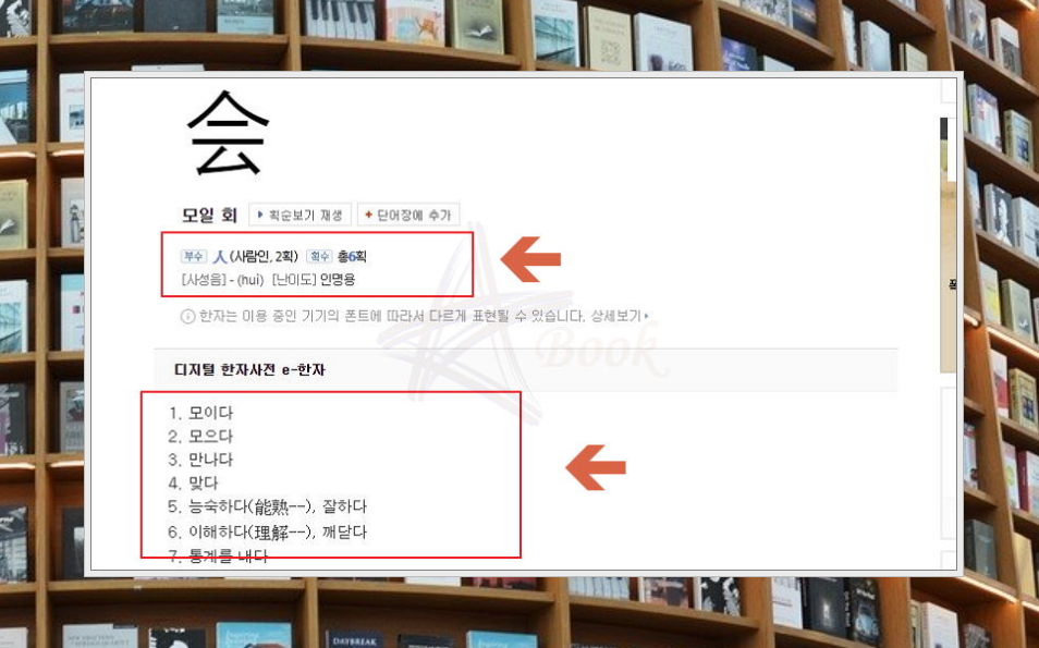 저는 '모일 회'를 선택했는데요. 설명을 보아하니 '사람 인'을 부수로 갖고 있네요. 총 획수는 6획이 맞고요. 뜻을 보시면 아시겠지만, 웬만한 옥편 책보다 많은 뜻을 알려줍니다. 같은 문자라도 의미가 이렇게 많을 수 있다는 점 참고해 주세요.