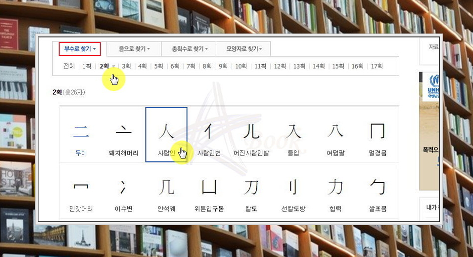 부수로 찾기 방식을 설명 드릴게요. 모든 한자에는 부수가 있습니다. 부수를 알고 있는 경우라면 이것의 획수를 선택한 다음에 부수를 찾아 클릭해 보세요. 저는 '사람 인'을 선택했습니다.