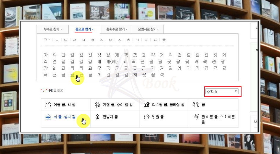이번에는 '음으로 찾기' 서비스를 이용해 보겠습니다. 찾고자 하는 문자의 한글 음을 알고 있을 때 사용하시면 되는데요. 사용 방법은 간단합니다. 찾고자 하는 문자의 한글 음을 선택하면 돼요. 그럼 해당 음을 가진 한자가 나타납니다.