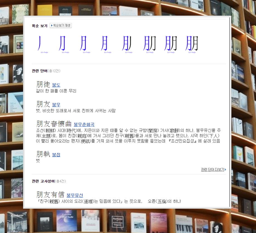 인터넷 사전에는 뜻 외에도 참고 정보, 획순 보기 등의 정보를 제공하고 있습니다. 관련 단어나 고사성어도 알아볼 수 있고요.