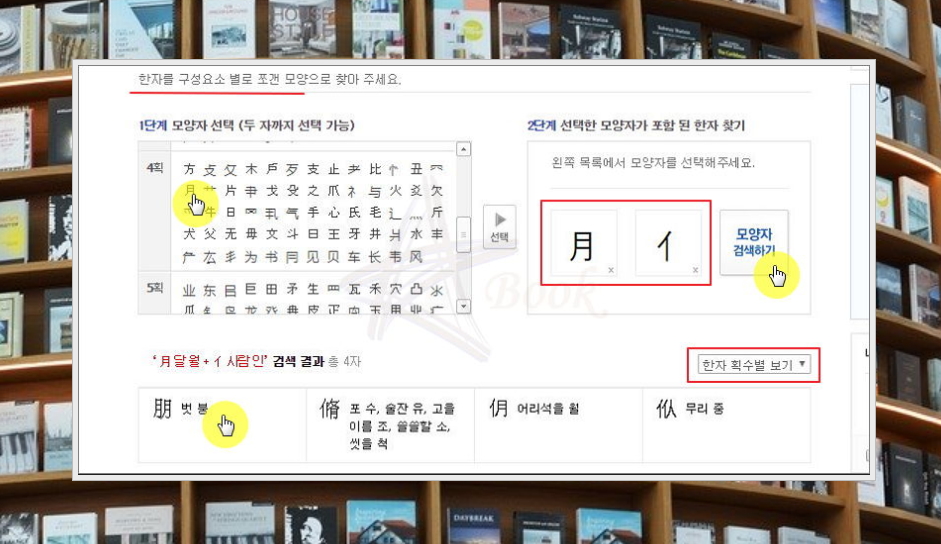 가장 사용 방법이 어려워 보이는 모양자로 찾기 방식입니다. 꼭 부수가 아니더라도 찾고자 하는 한자에 포함된 구성요소 2개를 선택해 주세요. 그 다음 [모양자 검색하기] 버튼을 누르면 이에 맞는 한자를 찾을 수 있습니다.