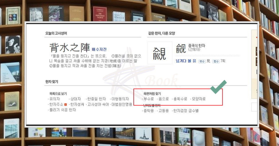 다른 사전과 달리 한자의 경우에는 여러 가지 사용 방법이 존재합니다. 종류가 많지 않은 표음문자와 달리 한문의 경우에는 사용이 되는 문자의 수가 많은 표의문자에 해당하기 때문인데요. 이러다 보니 한글 음, 총획, 부수, 모양자를 이용하여 사전찾기 진행을 할 수 있습니다. 요즘에는 그려서 찾는 방법을 많이 사용하는데요. 원하는 내용을 찾는 속도가 빠르고, 사용 방법도 쉽습니다.