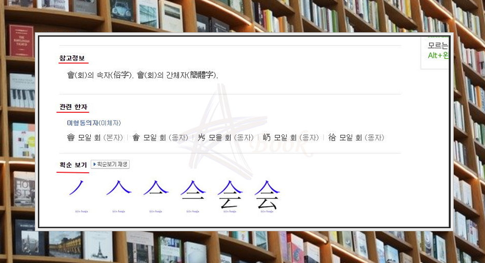 저는 '모일 회'를 선택했는데요. 설명을 보아하니 '사람 인'을 부수로 갖고 있네요. 총 획수는 6획이 맞고요. 뜻을 보시면 아시겠지만, 웬만한 옥편 책보다 많은 뜻을 알려줍니다. 같은 문자라도 의미가 이렇게 많을 수 있다는 점 참고해 주세요.